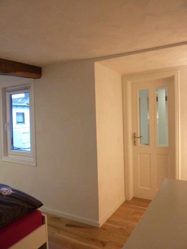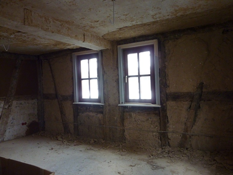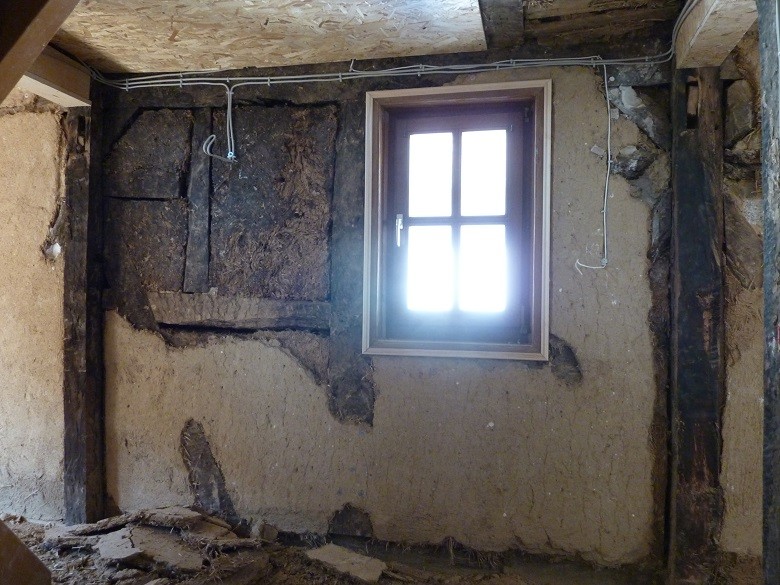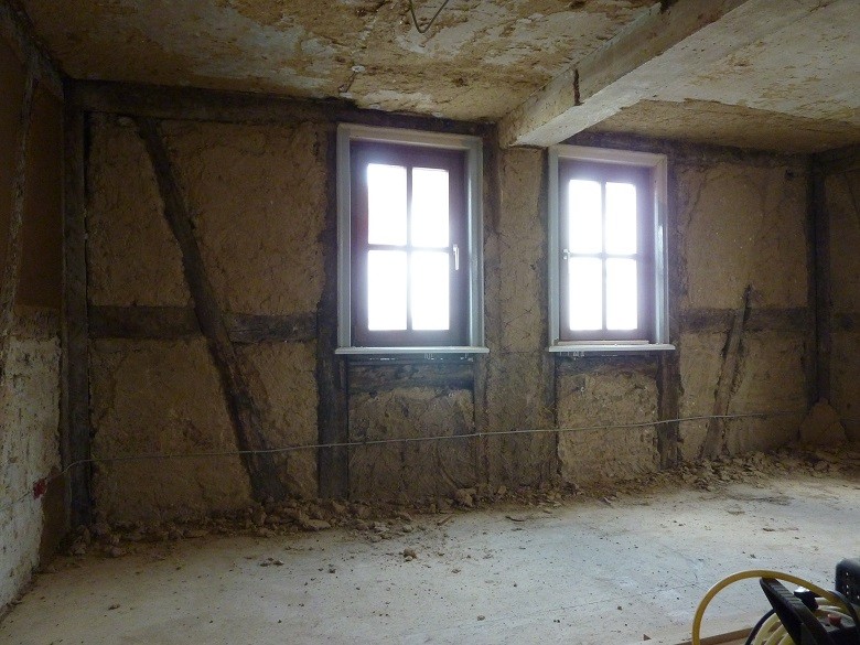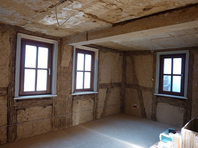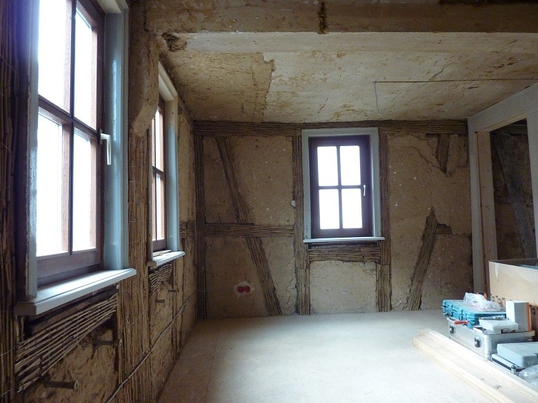 Bei dieser Fachwerkhaus Sanierung in 63674 Altenstadt werden nach dem Entfernen verschiedener Schichten fast alle Wände mit Lehmputz neu verputzt. Auch bei einigen Decken wurden neue Putzschichten aus Lehm aufgetragen. Alte Gefache mit Staken und Strohlehm wurden bei dieser Denkmalsanierung zum Teil mit wiederaufbereiteten Strohlehm derselben Gefache restauriert oder auch komplett mit Lehmsteinen und Lehmmörtel neu ausgemauert.