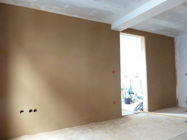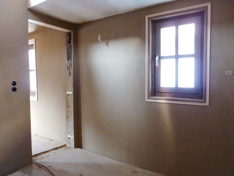 Als abschließenden Deckanstrich wurde Lehm-Streichputz (Lehmfarbe mit einem strukturbildenden Kornanteil ) aufgetragen.