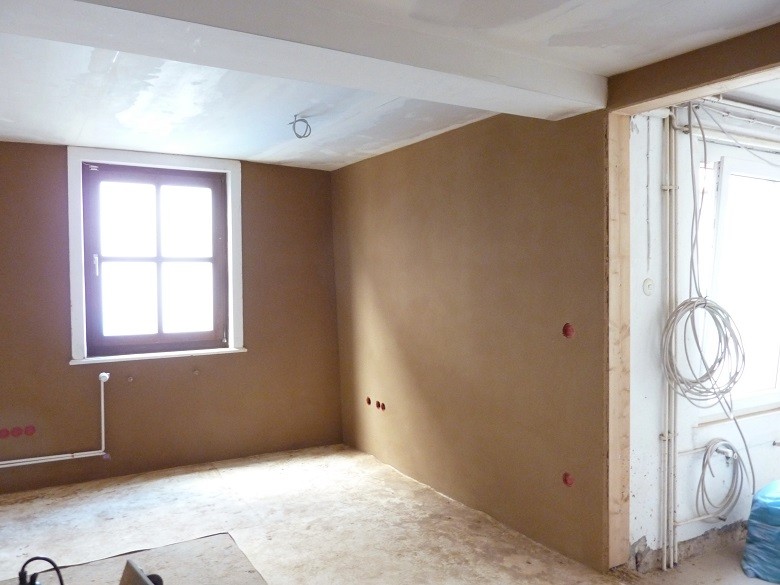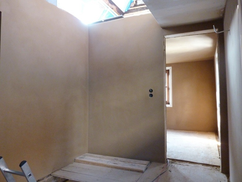 Die erste Putzschicht aus Lehm-Unterputz diente als Ausgleichsschicht, um Fehlstellen und großflächige Unebenheiten in der Wandfläche zu egalisieren.